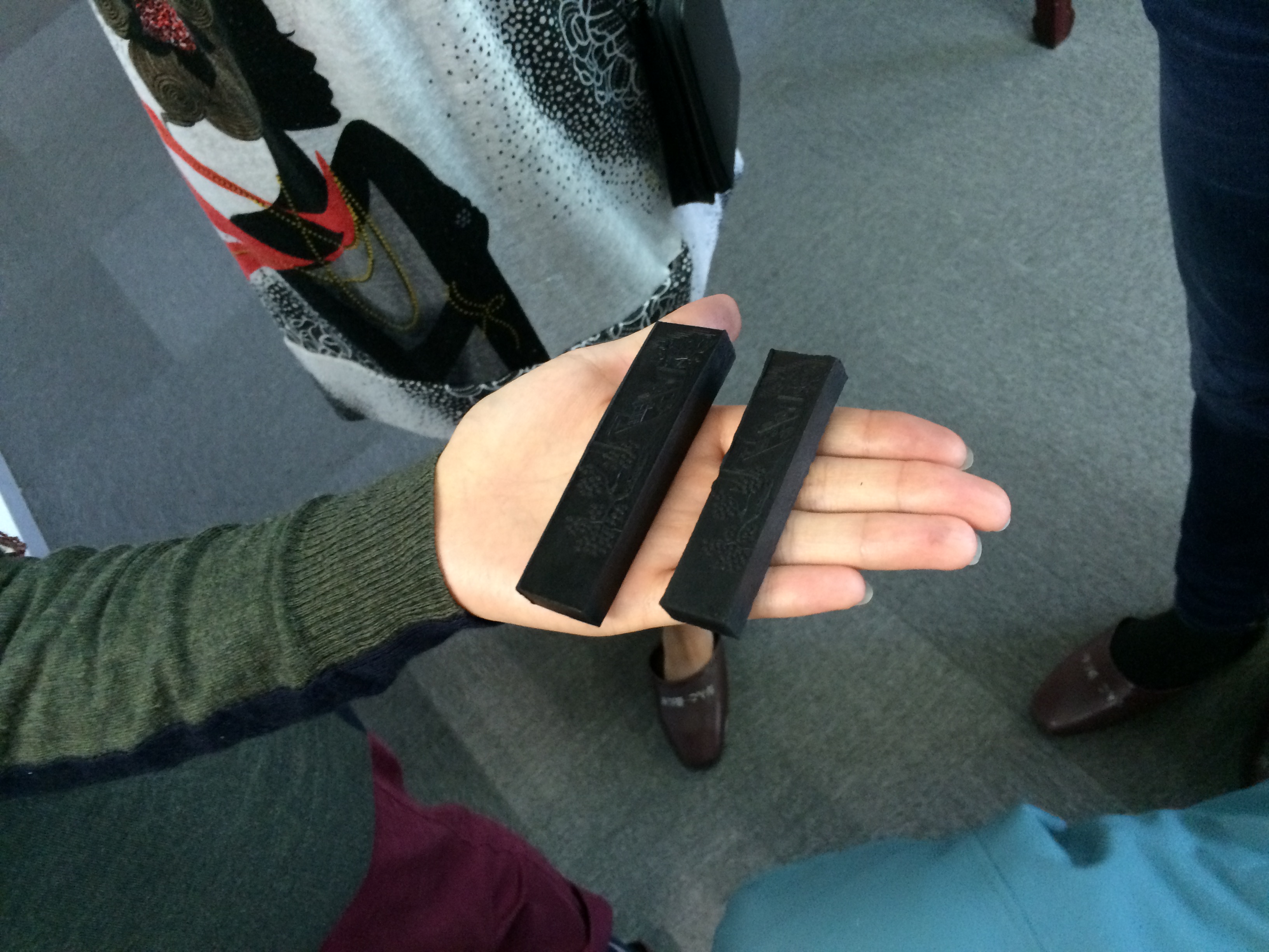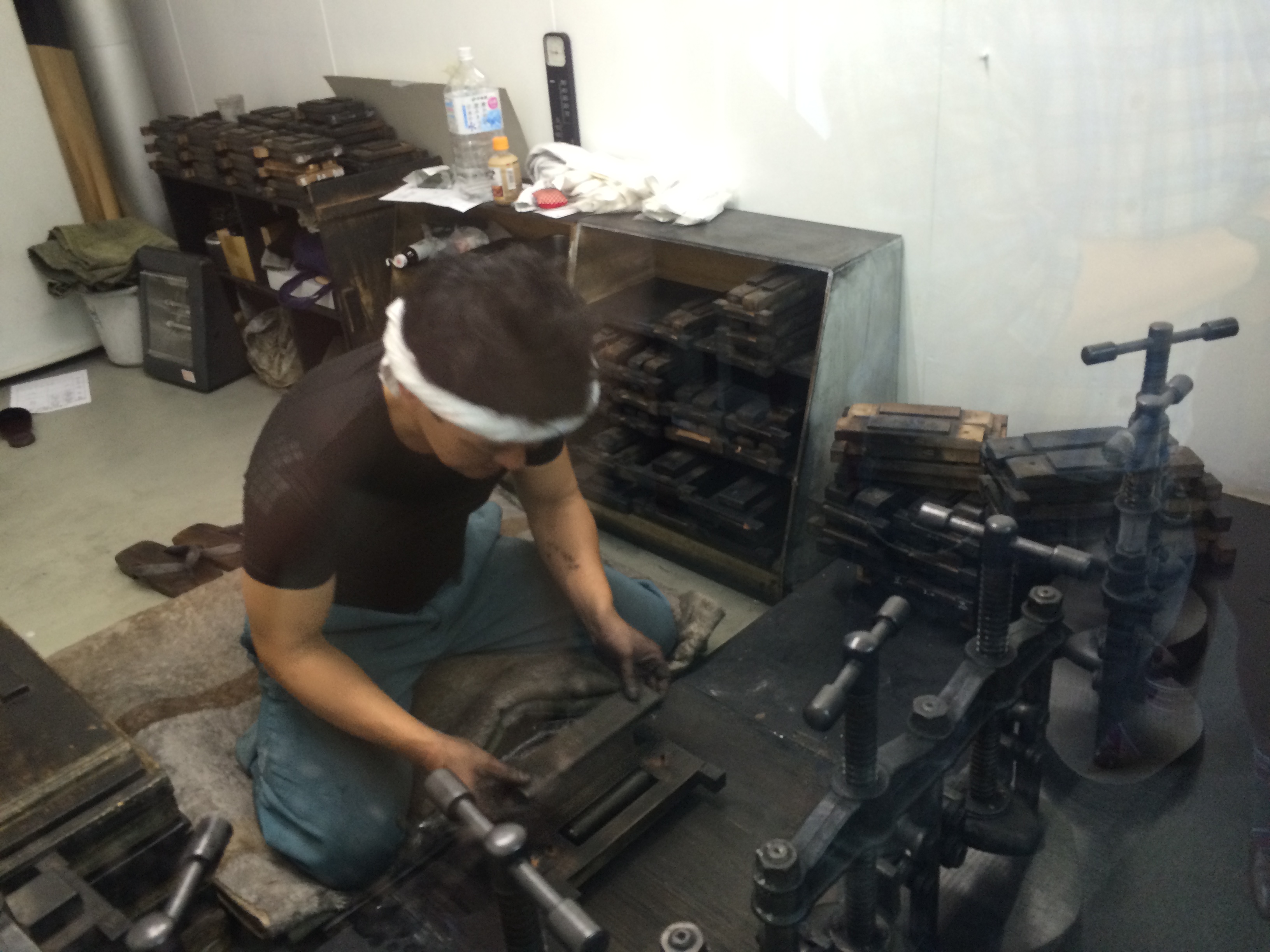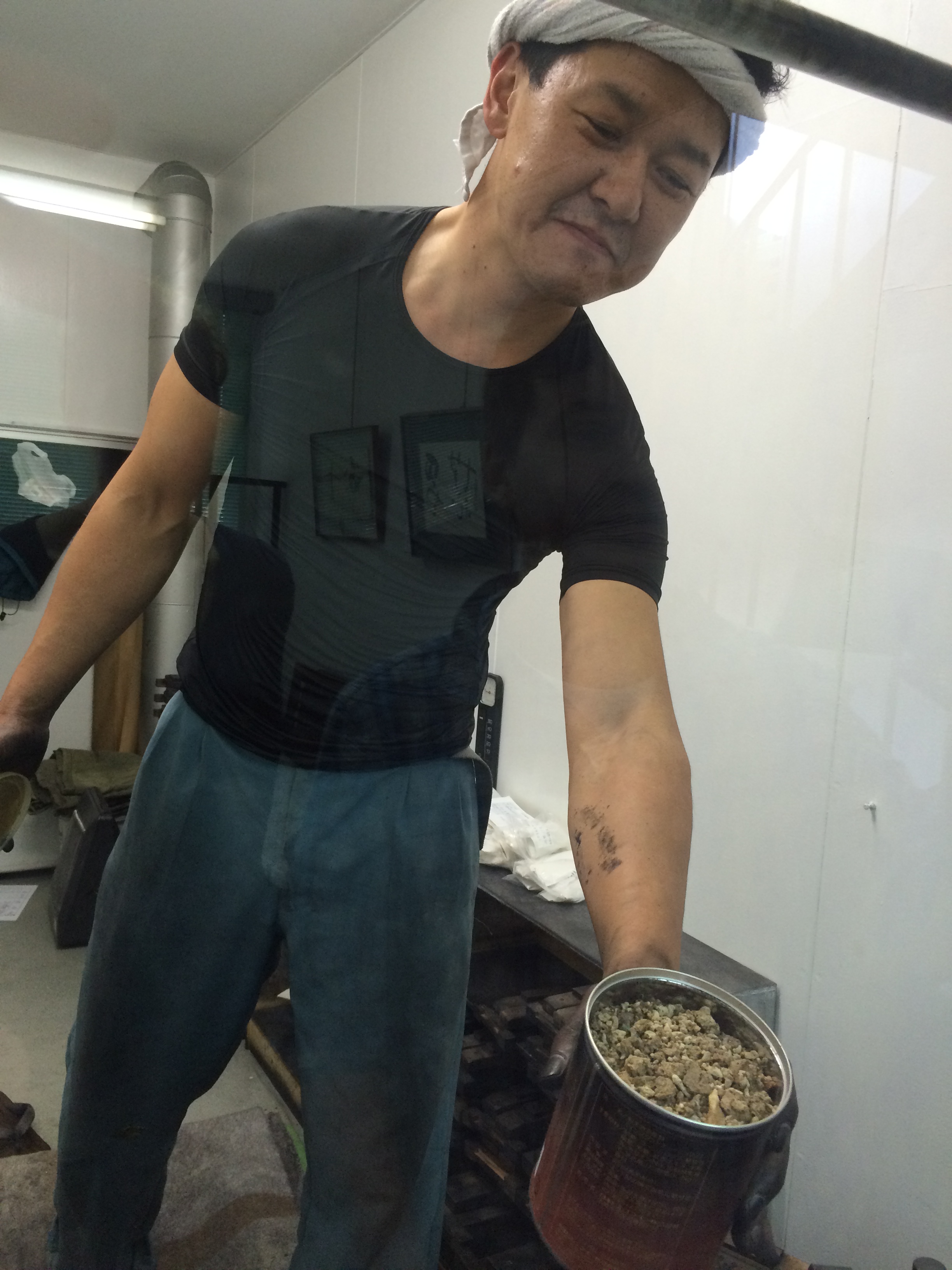 After lunch a few of went to see how sumi is made. Sumi ink is a hard ink made from soot that is bound with a type of animal glue, in Japan usually cow or deer. Our guide told us they currently use glue made from deer. After the mixture has been made up, the sumi maker rolls the big ball of sumi ink under his feet. This sumi ink is like a big black ball of tough dough. The rolling and the heat from his feet make it more pliable and easier to manipulate, like play-doh (which is kind of what it feels like). The bag of sumi “dough”, in plastic bag covered by a blanket under his butt, is kept warm by the sumi maker as he rolls out a measured quantity of dough. He then shapes into a cigar-like shape, puts it into the mold, puts the mold under pressure, and begins again. He’ll be able to make about 45 blocks an hour. After the ink hardens a bit, the molds are put into wooden boxes to dry. At this point the ink molds feel a bit like gummy erasers. As they harden, they shrink by about 20%. We asked the sumi maker how he is able to get his hands and arms clean, as they are covered in black ink. Apparently, the best tool of the trade to get one’s hands clean again is nightingale poo. He had a container full of it to show us. Unfortunately though, most of it was collected a while ago, and he had no idea how he would get his hands on more once he ran out. Maiko and geiko (or geisha, as non-Kyotoites call them) also used these droppings on their faces to help whiten them. Doing a little research about it, I found out that nightingale poo facials (known also as the Geisha Facial, or in Japan the technical uguisu no fun (nightingale feces)) are a popular beauty treatment for some people. I think I’ll hold off on trying it.